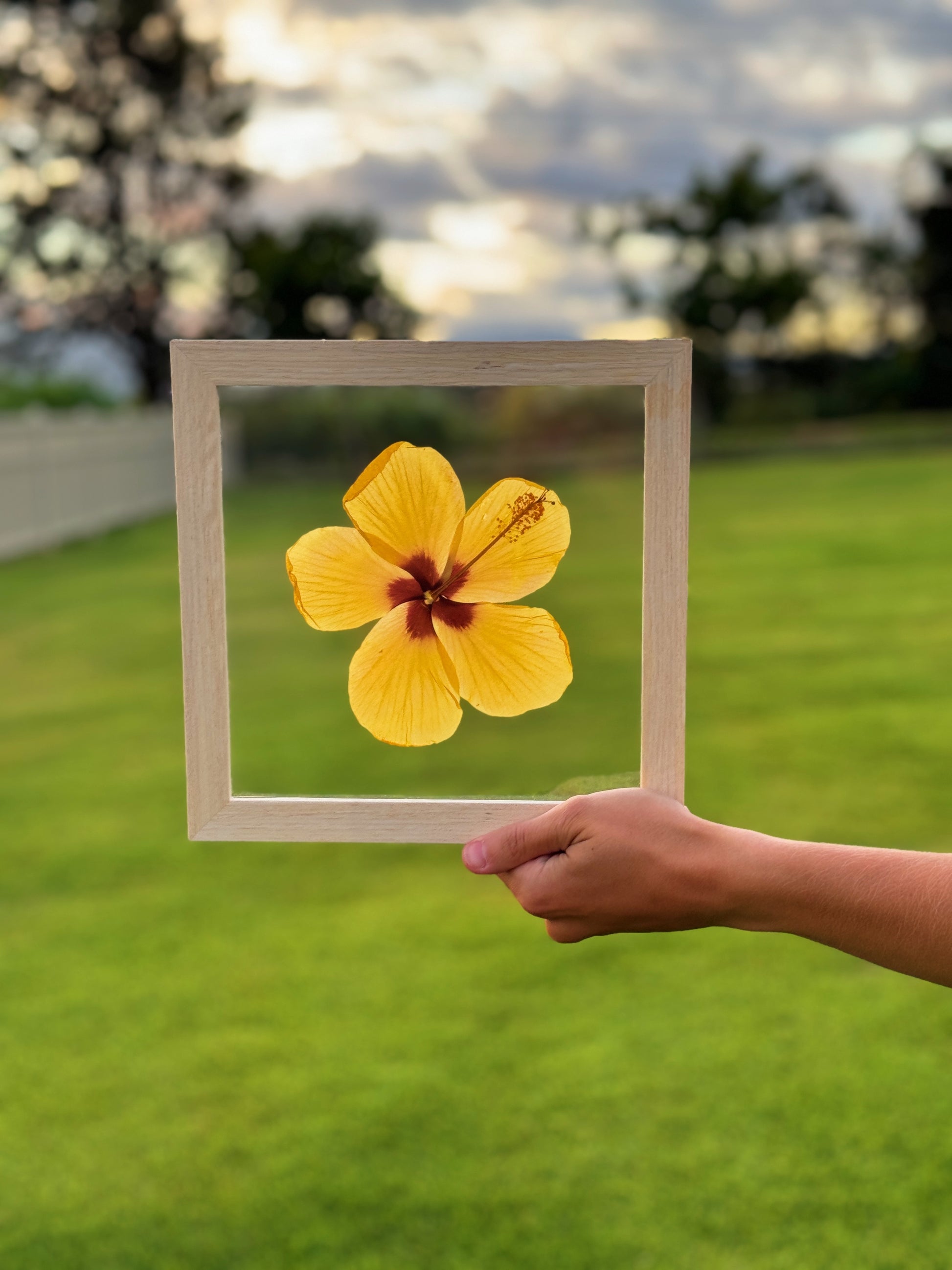 A piece of Hawai‘i to treasure forever. Each 8x8 frame features a real, hand-pressed hibiscus flower carefully pressed and preserved in a double glass frame. These pieces are perfect as gifts, home decor, or a keepsake from a special moment in the islands.